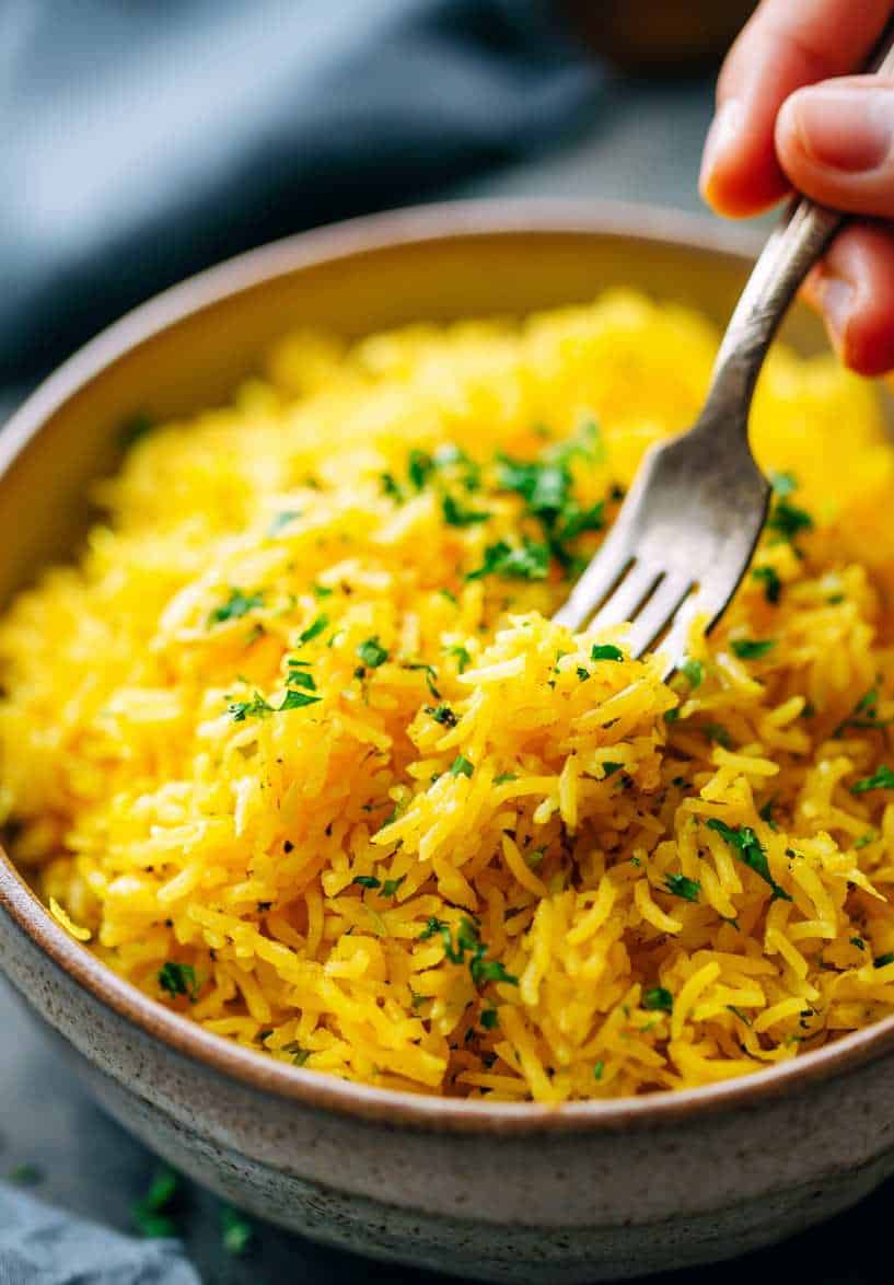 - Saffron Yellow Rice: Replace turmeric with a pinch of saffron steeped in warm water for a floral aroma and richer color—perfect for special occasions.